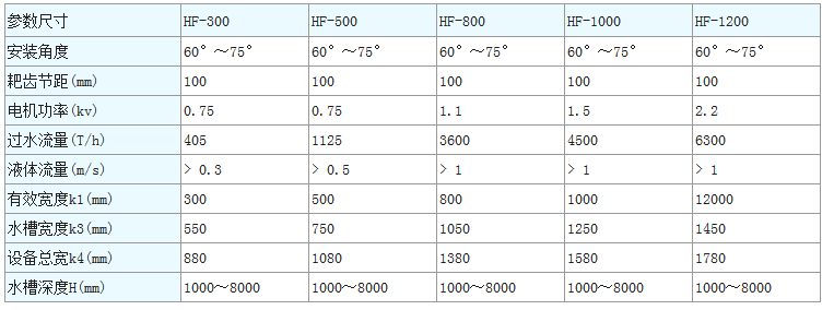 设备规格按机宽尺寸分HF300-3600型。机宽超过1800mm,则做成并联机。栅隙分为1mm、3mm、5mm、10mm、20mm、30mm、40mm、50mm等各种规格,由过水量、提升高度、固液分离总量和所分离物质的形状、颗粒大小来选择栅隙。可根据用户需要选用材质为ABS工程塑料、尼龙、不锈钢的耙齿制作;主体框架有不锈钢材质和碳钢防腐两种。